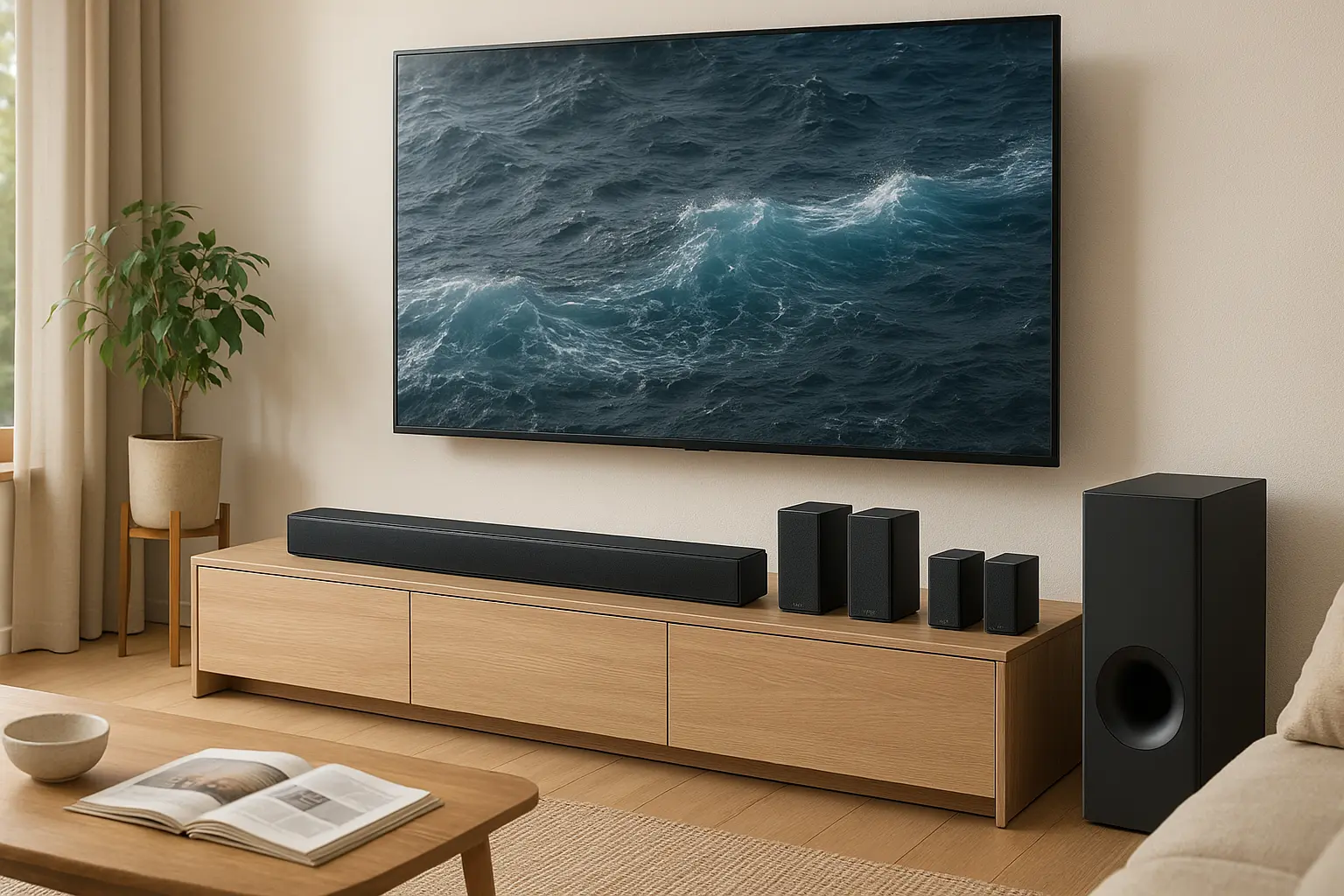 Você pode conectar via HDMI ARC, cabo óptico ou Bluetooth, facilitando a integração com sua TV.